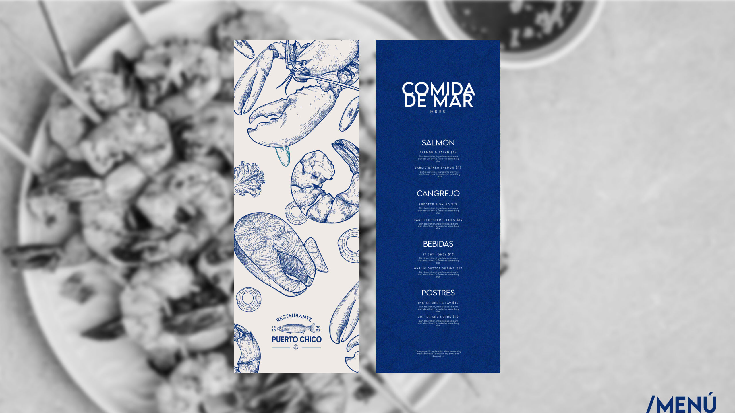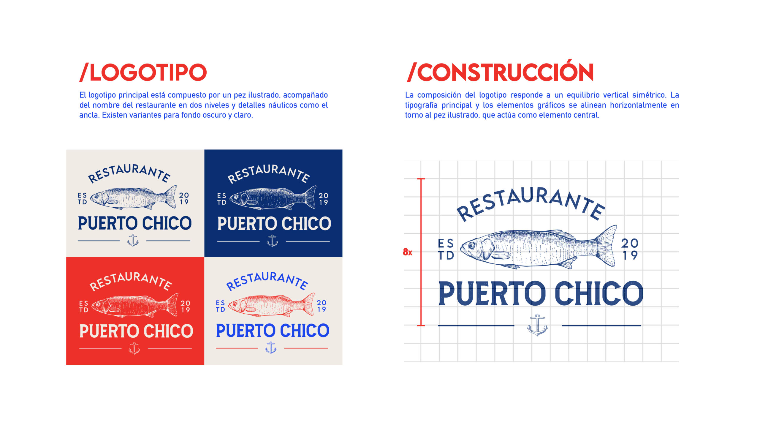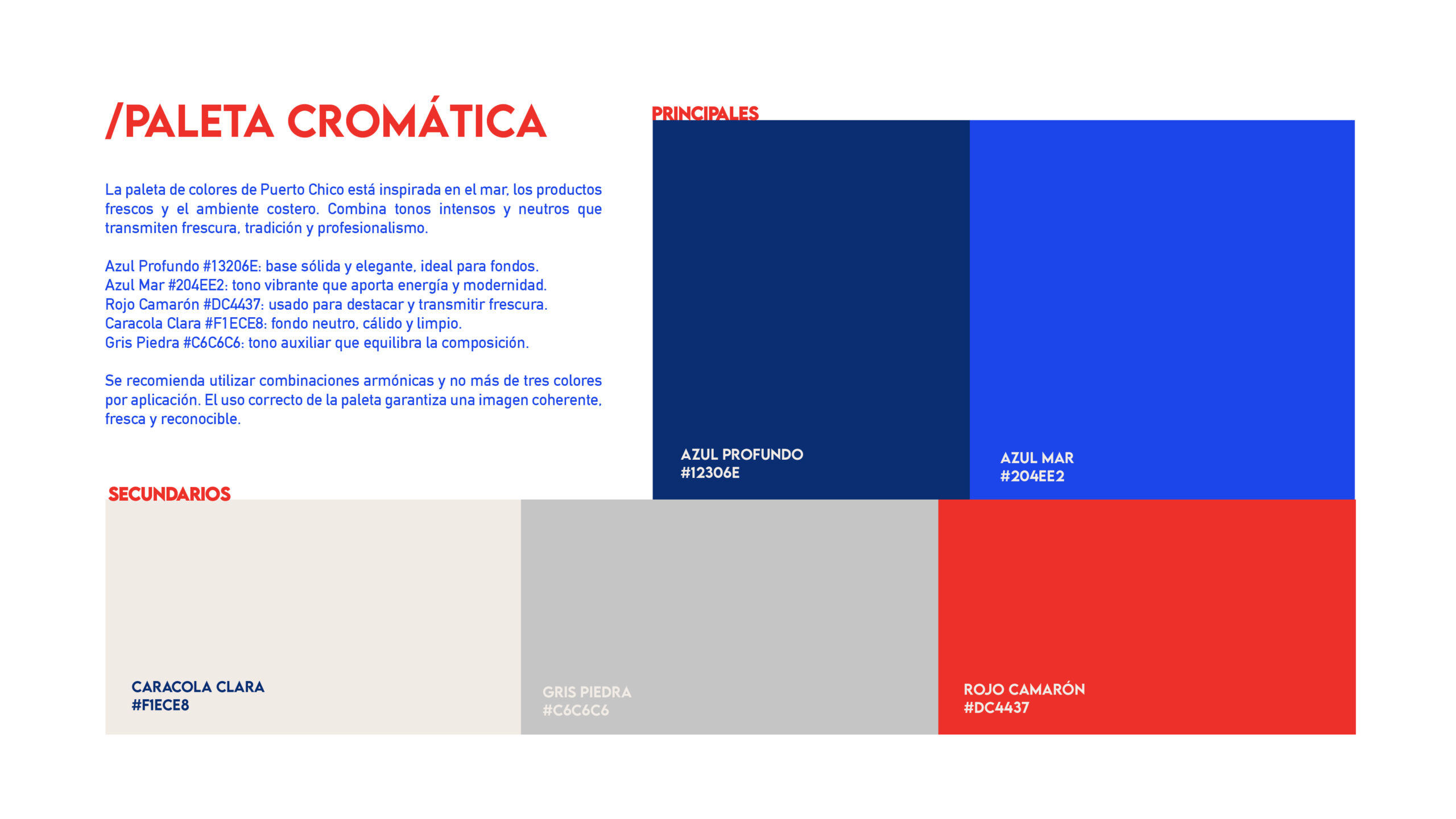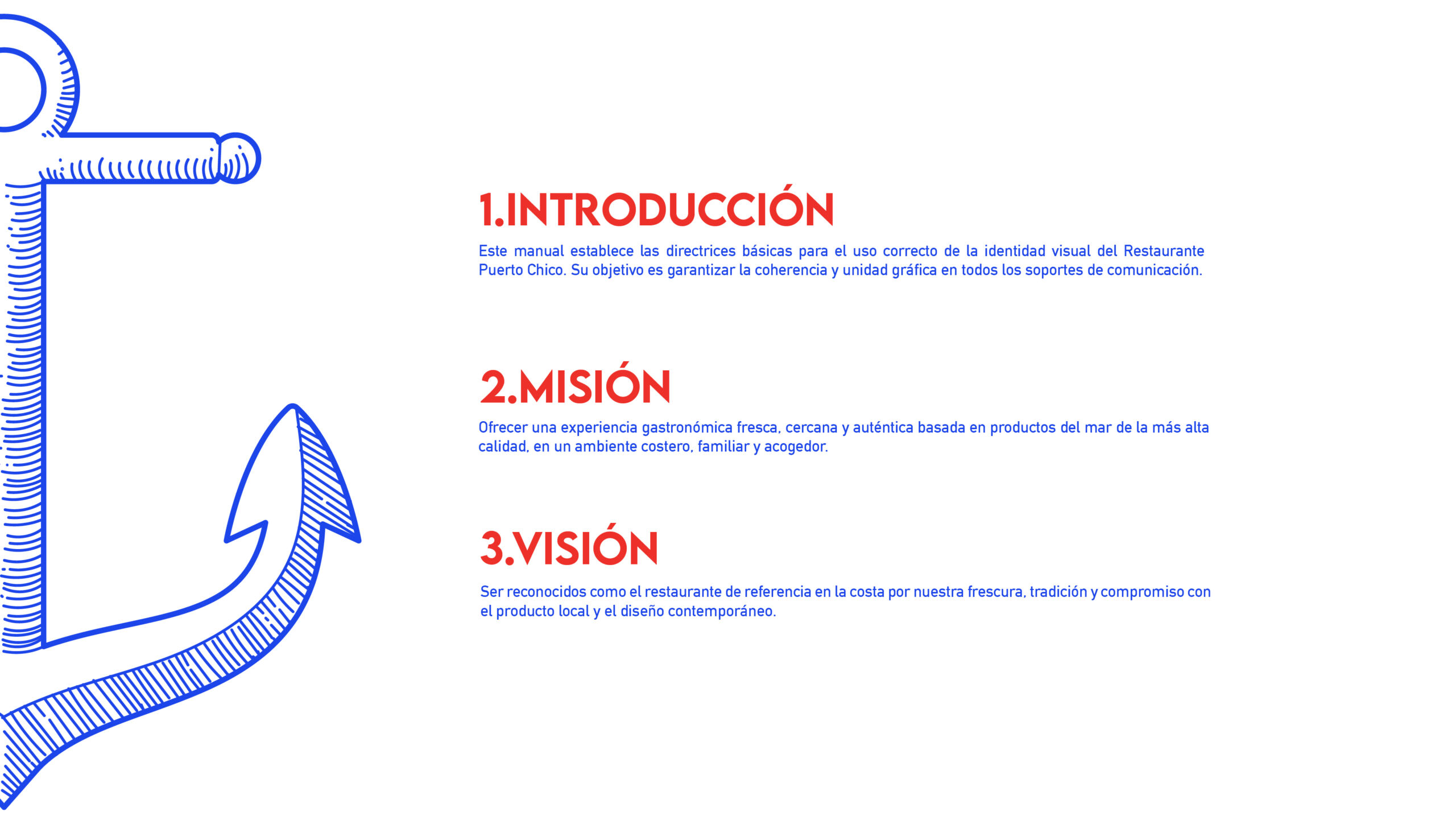 Puerto Chico es un restaurante que celebra la riqueza del mar con una propuesta gastronómica fresca, de alta calidad y comprometida con el producto local. Su identidad refleja un estilo costero contemporáneo que combina tradición y diseño, creando un espacio familiar y acogedor. Cada detalle, desde la paleta cromática inspirada en el océano hasta su logotipo con alma marinera, transmite la esencia de un lugar donde la frescura, la autenticidad y la calidez se encuentran para ofrecer una experiencia única frente al mar.